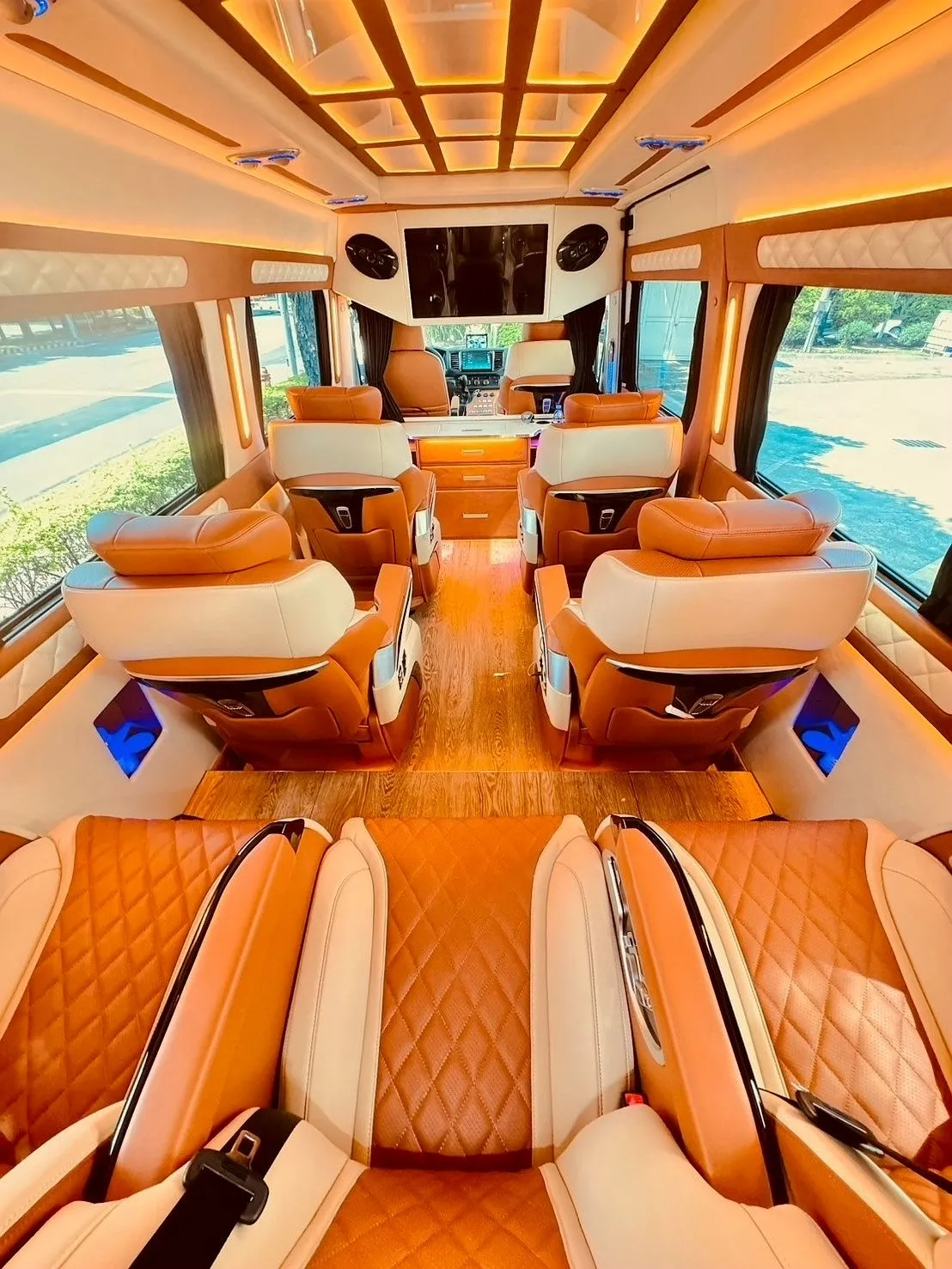 這次搭乘的是這台保母車,後車艙設計超奢華,就好像是行動私人招待所,哇~每次下車周遭的人都一直探頭往車內看,讓我有總巨星出場的感覺~哈哈,對於影音設備也超越了LM四座等級,中央設有一組30吋的液晶螢幕,並可透過HDMI界面將手機或電腦畫面投放在螢幕上,旅遊包車行程時可播放影片追劇,另外休閒時還可以開啟卡拉OK功能,三五好友閨密們包車旅遊一路歡唱到目的地,真棒~